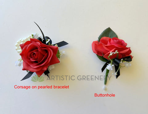 Corsage & Buttonhole - Red Rose with Black Ribbon - CB0048 - $56/set