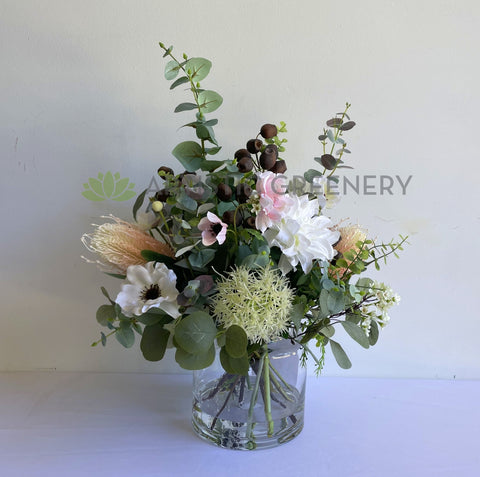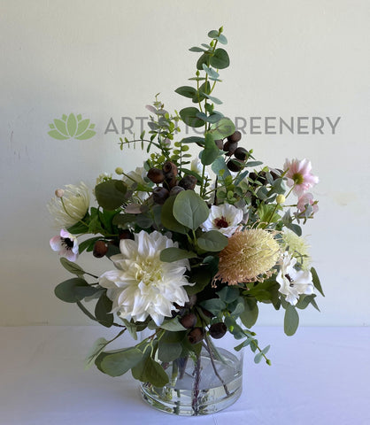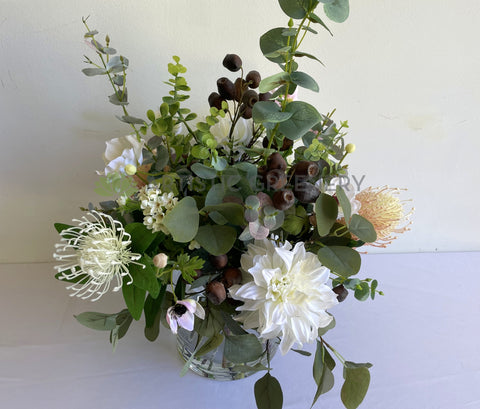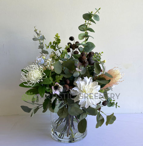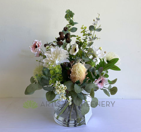 - Materials including mixture of artificial natives flowers and greenery in a glass vase. Flowers can be seen from all the way around