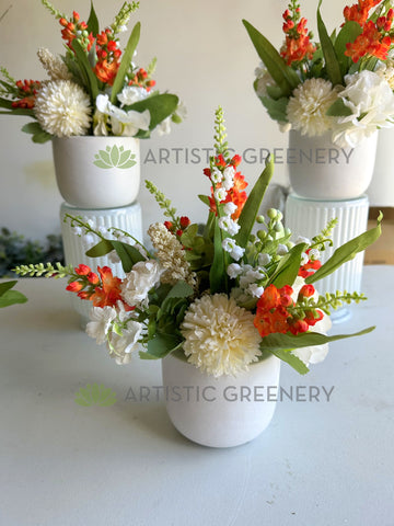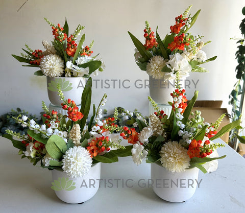 - Artificial mixed style floral arrangement (mainly orange and white colours) - made of artificial flowers