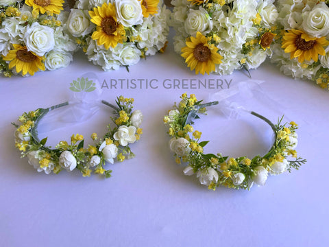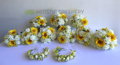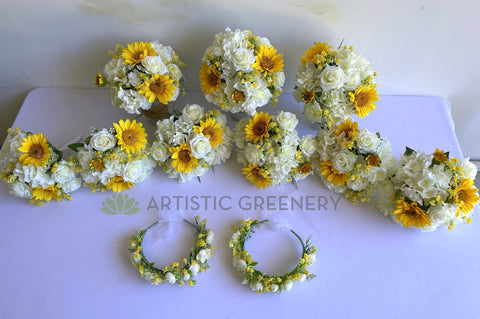 - Bridesmaids' bouquets: Silk sunflowers with white roses and hydrangea, handle wrapped with white satin ribbon - $80 each