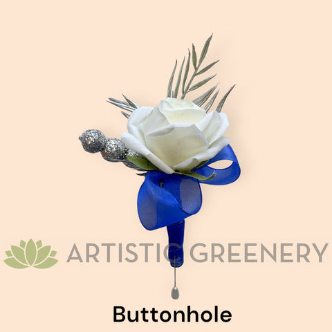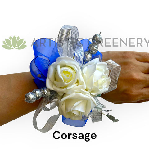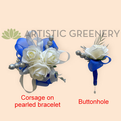 Corsage & Buttonhole - White Roses with Silver & Blue - CB0050 - $60/set