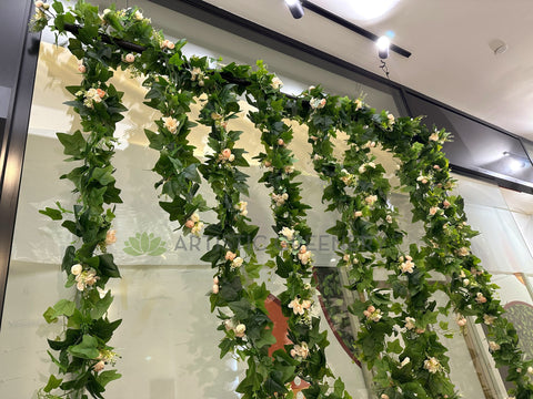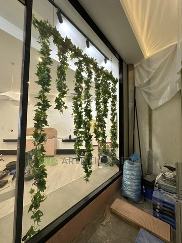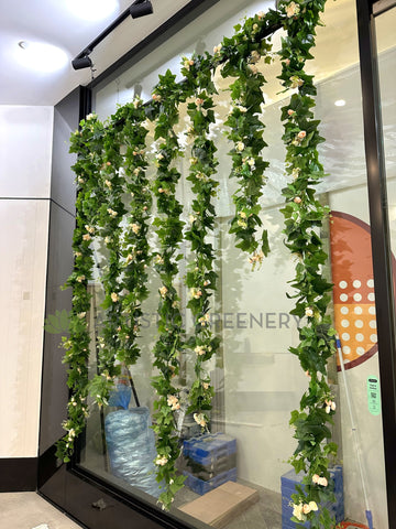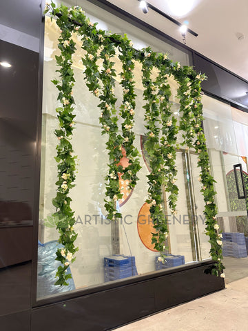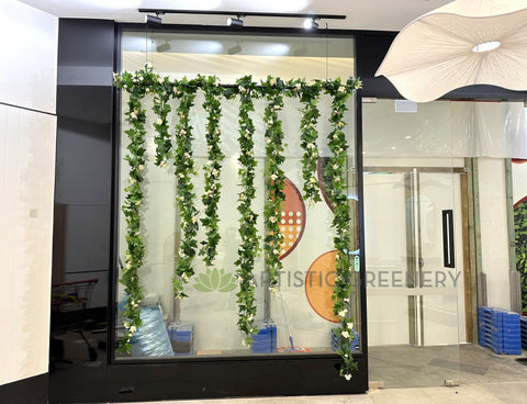 Description: custom-designed artificial draping vines with flowers for shop front display.